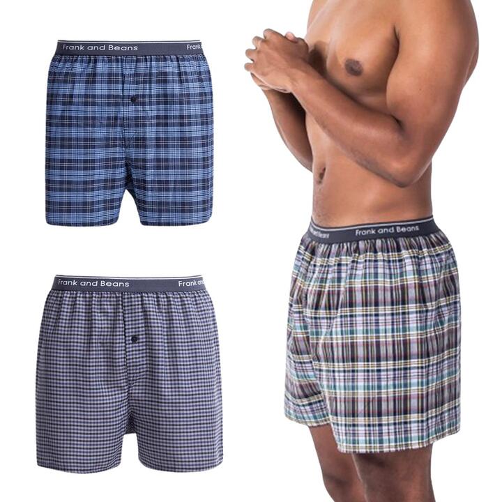 Triple the Plaid Fun with This 3-Pack of Boxer ShortsReady to level up your basics with some plaid power? This 3-pack of mens boxer shorts from Frank and Beans® is your ticket to style and comfort. Featuring Midnight Tartan, Ocean Gingham, and Alpine Check, these cotton boxer shorts bring a trio of plaid boxer vibes that’ll make your drawer pop—perfect for any day of the week.Woven Wonders with a Classic TwistThese woven gems are anything but ordinary boxer shorts. Crafted from premium cotton, they’ve got that woven boxers feel with a button-fly design that’s pure retro cool. The Traditional Fit keeps it laid-back, while a subtle Plaid Pop Stitch along the hem adds a little flair to these guys boxer shorts.Why You’ll Love This Plaid TrioSlip into these woven boxer shorts mens and feel the plaid magic. Midnight Tartan brings sleek vibes, Ocean Gingham adds a coastal touch, and Alpine Check gives rugged charm—all in one pack of woven boxers men. Perfect as mens undies, they’ve got the roomy fit and no-slip grip to keep you comfy from sunrise to sunset.Built by Frank and Beans® with Aussie spirit since 2009, these mens boxers are your go-to for plaid perfection. Grab your 3-pack and let the patterns shine!