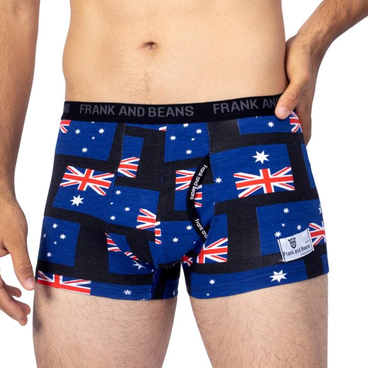 Aussie Pride with Australian Flag Boxer BriefsRaise the banner of true-blue spirit with these Mens boxer briefs, where a dazzling Australian flag pattern meets a bold, eco-friendly black waistband—a single burst of Down Under glory for Men! This mens trunk underwear icon from Frank and Beans® is crafted with modal fabric, featuring a SoftFlex waistband and a 3D front pouch for rugged, eco-conscious comfort. With a Active Fit, these mens boxers unleash a side seamless design and a Front exit pocket for practicality—a proud choice for mens underwear that celebrates Australia’s heart.Smooth Comfort Meets Patriotic FlairThese aren’t just any boxer underwear. Forged to fuel your Aussie adventures, they’re your menswear underwear legend that keeps you cool and unstoppable with moisture-wicking fabric through every sun-soaked moment. With a breathable design, a no-ride-up fit, and a printed size tag to prevent itching, they’re crafted for all-day wear, whether you’re conquering the outback or kicking back by the barbie. The fit delivers a bold, grounded feel, making this a prime mens cotton underpants contender. Hungry for more? Explore our mixed packs!Signature ColourTag DistinctionEach pair is adorned with a sleek grey ColourTag® on the waistband, an emblem of superior craftsmanship that elevates these Mens boxer briefs to legendary status. This refined marker ensures your mens trunks radiate authenticity and Aussie pride with every wear.Why You’ll Love These Australian Flag Boxer BriefsStep into an eco-conscious roar of confidence with these underwear trunks men. The ultra-smooth modal fabric delivers unmatched comfort, while the breathable design keeps you fresh from dawn to dusk. Perfect as a fierce Mens trunks choice, they offer a roomy fit and quick-drying fabric for effortless wear. Looking for more bold styles? Explore our collection!Built by Frank and Beans® with a legacy of quality since 2009, this Mens boxer briefs is your go-to for an Aussie pride vibe. Grab yours and experience the world’s best underwear!