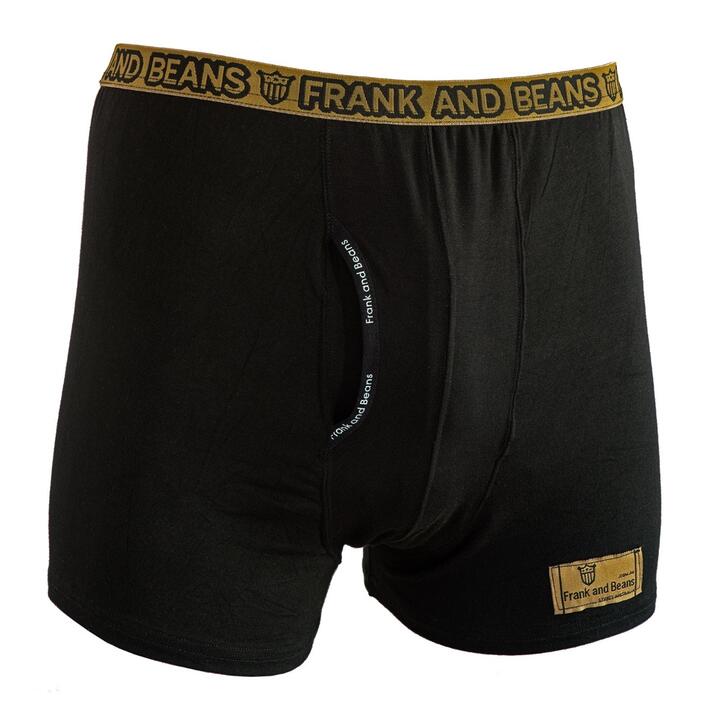 Jet-Black Allure with Black Boxer Briefs and Gold WaistbandIndulge in the ultimate luxury with these boxer briefs in jet-black, accented by a designer gold waistband—a single piece that defines sleek sophistication for Men! This boxer underwear gem from Frank and Beans® is crafted with modal fabric, featuring a 3D front pouch, a side seamless design, and a Front exit pocket for practicality. With a Roomy fit, these guys boxer briefs offer an active fit and quick-drying fabric for aussie mens underwear elegance—a refined choice for any fan of male trunk underwear.Smooth Comfort Meets Designer StyleThese aren’t just any boxer briefs. Designed to elevate your wardrobe, they’re your boxer underwear essential that keeps you cool and poised with moisture-wicking fabric through every moment. With a breathable design, a no-ride-up fit, and a tag-free experience, they’re crafted for all-day wear, whether you’re commanding the day or unwinding at night. The fit ensures a snug feel, making this a luxurious addition to your collection. Want more mixed packs? Check out our collection!Why You’ll Love These Black Boxer BriefsStep into refined confidence with these male trunk underwear. The ultra-smooth modal fabric offers unmatched comfort, while the breathable design keeps you fresh from dawn to dusk. Perfect as a sophisticated boxer briefs choice, they provide a roomy fit and a no-ride-up design for effortless wear. Looking for more modal styles? Explore our modal collection!Built by Frank and Beans® with a legacy of quality since 2009, this boxer underwear is your go-to for jet-black allure. Grab yours and experience the world’s best underwear!